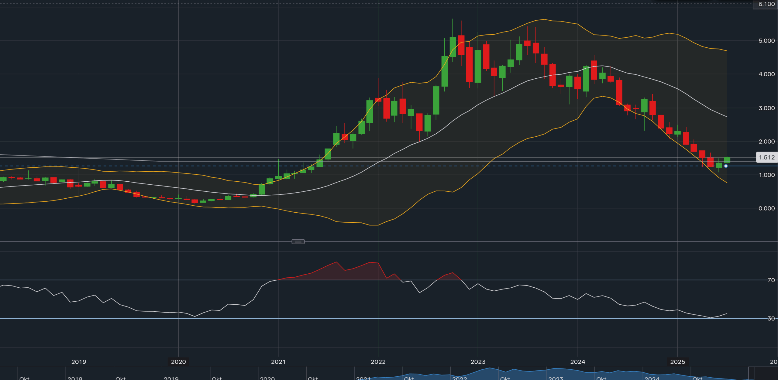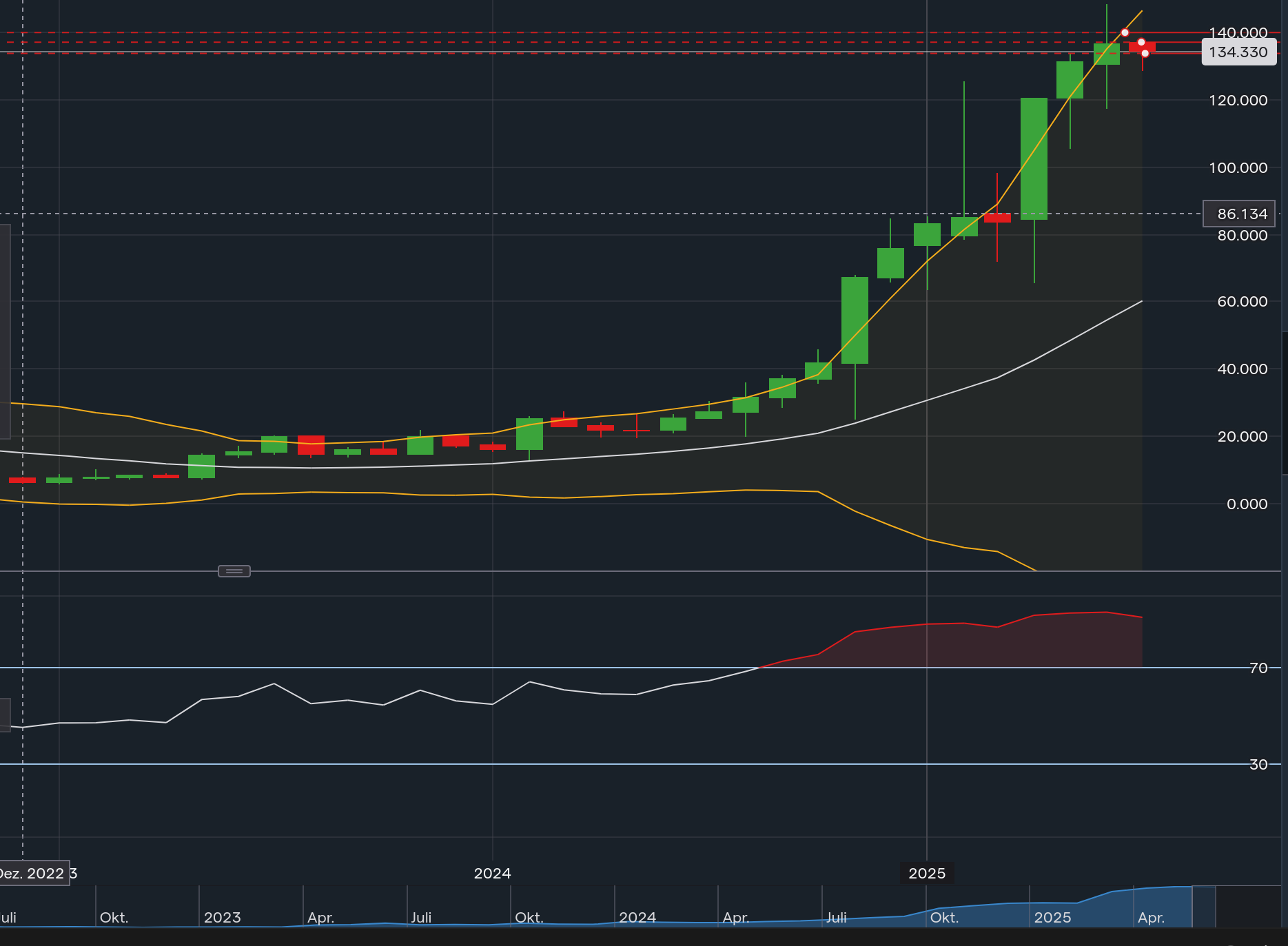 This stock is (in my believe) very overheated and I chose to got short. So far I have made some profit, but this is not done, yet. Here, I put 3 bets with each 9 pieces on, because my bets were too small and the margin requirement high (about €750). I am not sure, yet, if I should set more bigger bets on this one. As you can see at the bottom the RSI is going ballistic (like 90) on a monthly basis, which means that it is overbought.