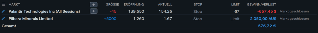 The profit is now back down at +29% (including Tesla). That’s quite a hit in the stomach compared to last week. But since I don’t trade with any stop loss or trailing loss while away from the action, it’s still an OK status. The profit that is taken in the end is of importance. I might change the limit of Palantir to around 100$ to take a profit, because that stock is full of freaks and you can never know if it’s run down to 100$ and then back up to 130$ within a day.