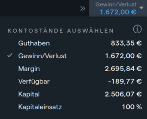 The profit is the same at around 28% (€2506 – €1950 / €1950). Almost no change compared to last week. But the next week could be a burner. Volatility. A traders / gamblers dream.