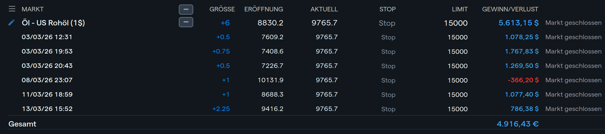The beginning of last week was quite turbulent as the price was jumping and overtook some steps. It went to 115$, just to fall back to one of my entry prices of 76$. I got into a position at around 102$ and at first it went up like nothing, but then it almost crashed the account as you can see. I made a big mistake by not setting a stop value. Luckily it was just the size of 1 lot and not more. Certainly, many accounts have crashed from that volatility. The fallback was totally unexpected and caused by false claims and tweets by the US administration. The same administration, which started this whole thing. I am still thinking that they have too much arrogance and no idea what they are actually doing. It’s like the movie dumb and dumber, just in a very bad way. So far the whole thing is still working for me as I am betting against them, although I have to be more careful than with the other bets, because my betting style is really risky. I made some more long bets on Oil and the profit is growing.